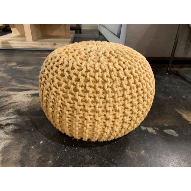 A wide variety of yellow pouf options are available to you, such as general use, design style, and material. It is a knitted round pouf and the beige color is beautiful but seems to be. Yellow pouf next to a rattan armchair and flowers on wooden patio with striped pillows on sofa.